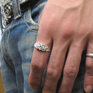 3月誕生石アクアマリンサンタマリアを一粒使用した、クロス&ハートデザインのシルバー製メンズリング(指輪)です。