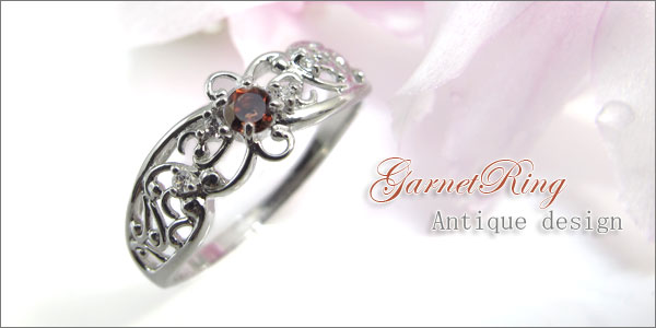 1月誕生石ガーネットを一粒使用したアンティークデザインのプラチナ製リング(指輪)です。