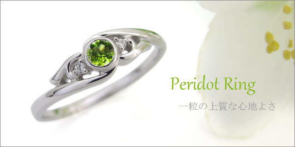 8月誕生石ペリドットを一粒使用した、18金製のシンプルデザインリング(指輪)です。