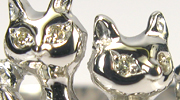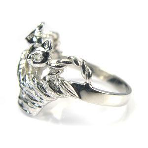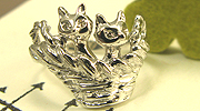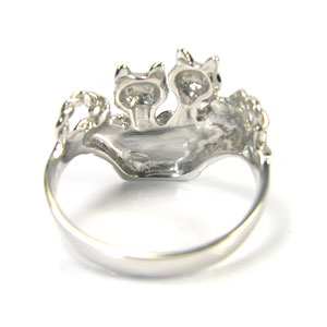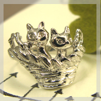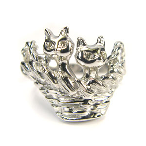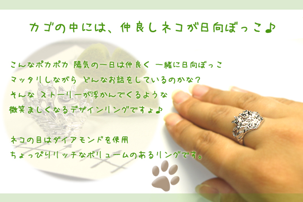 ![]() 4月誕生石ダイヤモンドを使用した、10金製の猫モチーフリング(指輪)です。 かごの中からちょこんと顔を出した2匹の猫たちが愛らしく、 眺めているだけで癒される猫リングです。