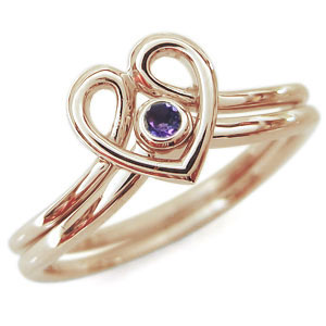 2月誕生石アメジストを一粒使用した、2本セットの18金製の、ハートモチーフピンキーリング(指輪)です。