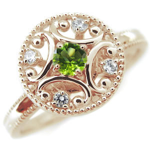8月誕生石ペリドットを使用した、アンティークデザインの10金製リング(指輪)です。 中央の天然石を囲むような繊細な透かし模様に、散りばめられたダイヤモンドや 全体にミル打ちを施したデザインは、優雅でアンティークな雰囲気が漂います。