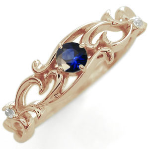 9月誕生石サファイアを一粒使用した、18金製のアラベスクデザインリング(指輪)です。 しなやかで繊細な唐草模様が、美しく優しい女性をイメージさせるリングです。