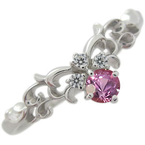 9月誕生石ピンクサファイアを一粒使用したプラチナ製のティアラ&唐草モチーフリング(指輪)です。