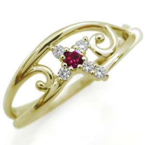 | 7月誕生石ルビーを使用した 10金製のクロス&アラベスク(唐草)モチーフのリング(指輪)です。 クロスの中央に誕生石をあしらったデザインが、 女性らしさと存在感漂う魅力的な指先を演出してくれます。 | |||||||||||||||