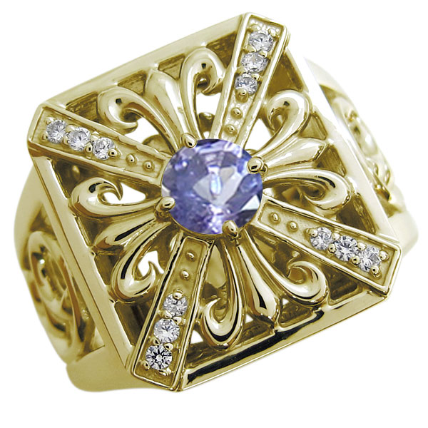 ![]() 12月誕生石タンザナイトを一粒使用した、 10金製クロス&百合の紋章モチーフメンズリング(指輪)です。 クロスと百合の紋章の組み合わせがクールなメンズリング。 サイドの唐草(アラベスク)模様の透かしが、貴方の手元をゴージャスに演出します。