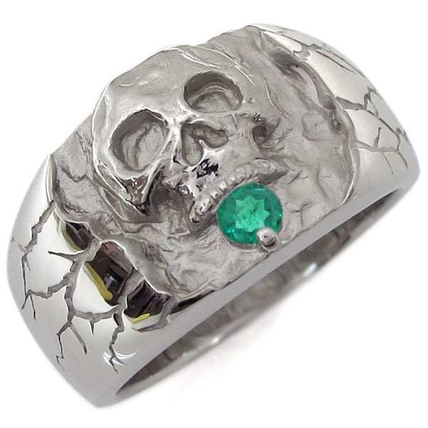 5月誕生石エメラルドを一粒使用した、プラチナ製のスカル(骸骨)をモチーフしたメンズリング(指輪)です。