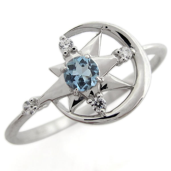 3月誕生石アクアマリンサンタマリアを使用した、プラチナ製の三日月(ムーン)星(スター)モチーフリング(指輪)です。