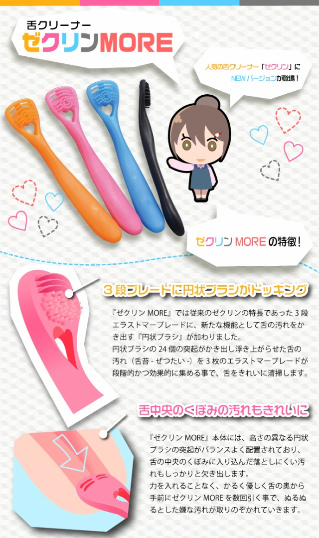 舌クリーナー『ゼクリン MORE』は歯科医師と歯科衛生士が、舌の汚れを優しく効率よく除去するために開発した舌ブラシです。