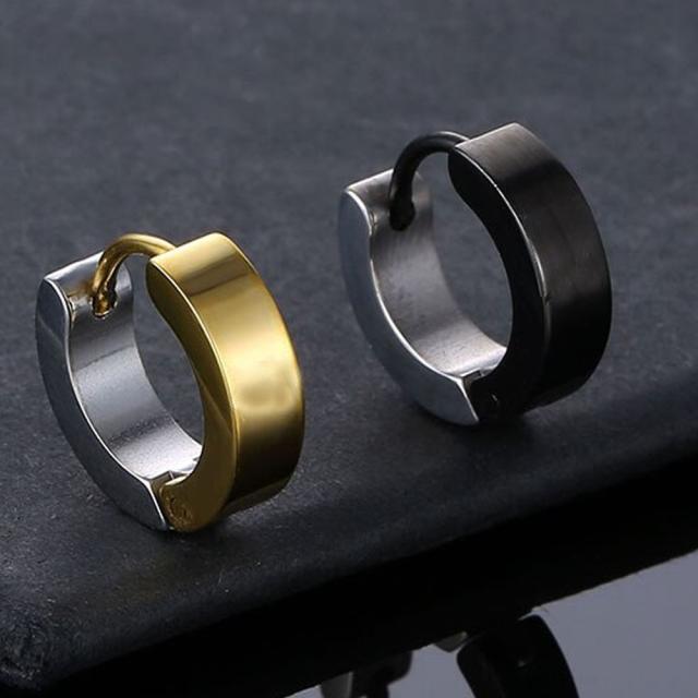 シンプルでプレーンなステンレスピアスの片側だけを黒色ブラックと金色にゴールドメッキしたツートンカラーのオシャレなリングピアス。