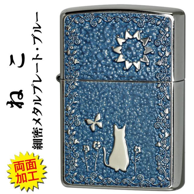 ジッポ zippo ジッポーライター猫 ネコ・細密メタルプレート貼り ブルーペイント 両面加工 かわいい ギフト プレゼント キュート 送料無料 メール便対応