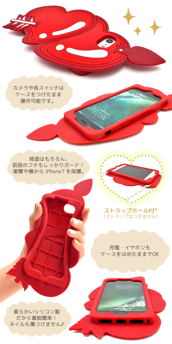 2つのハートが射抜かれたアローハートデザインのシリコンケースです。 衝撃やキズなどからiPhone6/6s/7を守るのはもちろん、カメラ、イヤホンや各種ボタンなどをケースに入れたまま操作可能です。シリコン製なのでやわらかく着脱も簡単! 便利なストラップホールも付いています。※iPhone6/6s/7本体は付属しません。※ライセンス商品ではありません。※スクエアサイズでのフラッシュ撮影時にケースの色が移りこみます。 ※カメラについては「カメラ使用時の注意」もよくお読みください。