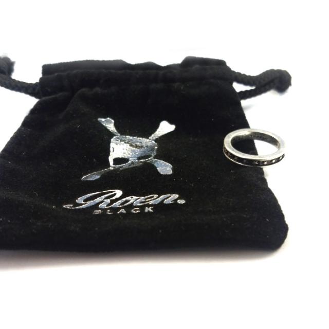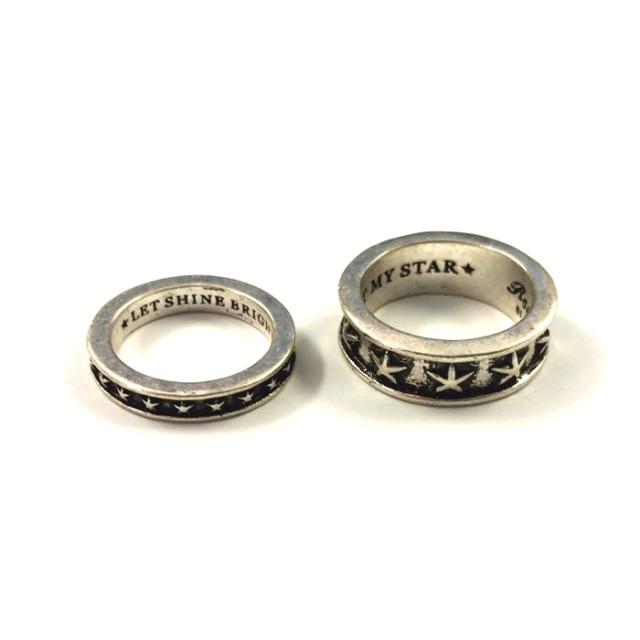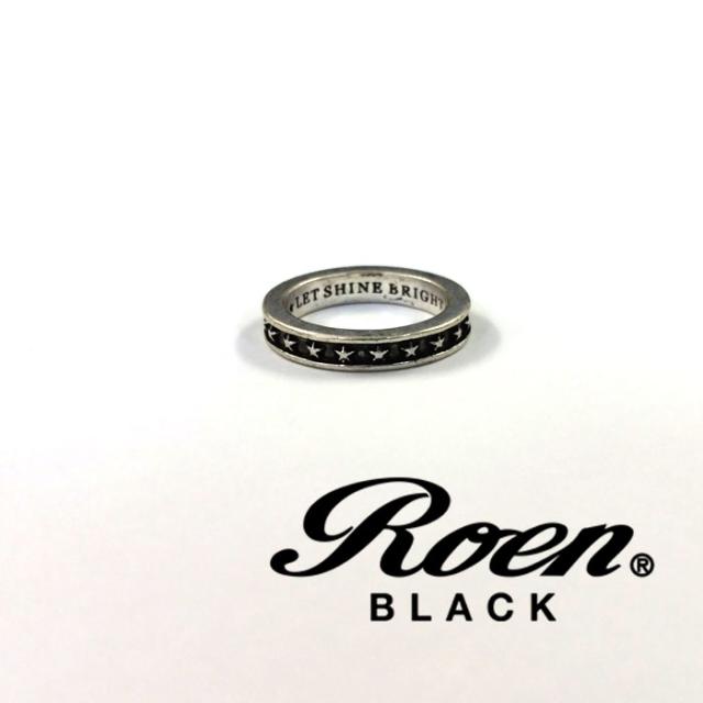 スターを全周にあしらったデザインの細めタイプのリング。太めタイプ(RO-652)もあります。ペアでもできるサイズ展開。リングの内側には『LET SHINE BRIGHT MY STAR★=自分の星を明るく輝かせなさい…』のメッセージとRoen BLACKのロゴ入り。