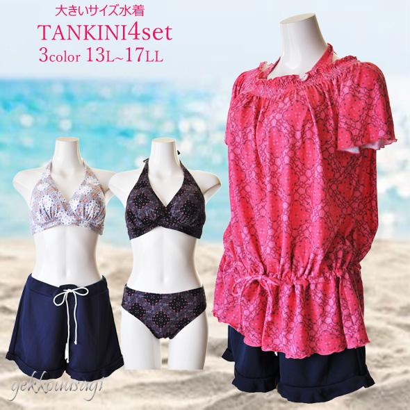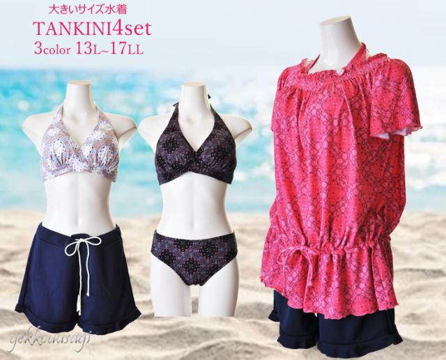 13号/15号/17号 L/LL/3L 大きいサイズ ホルターネック水着4点セット ショートパンツ トロピカルビーチ 282
