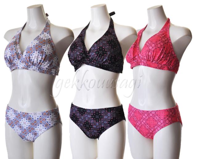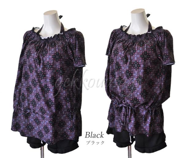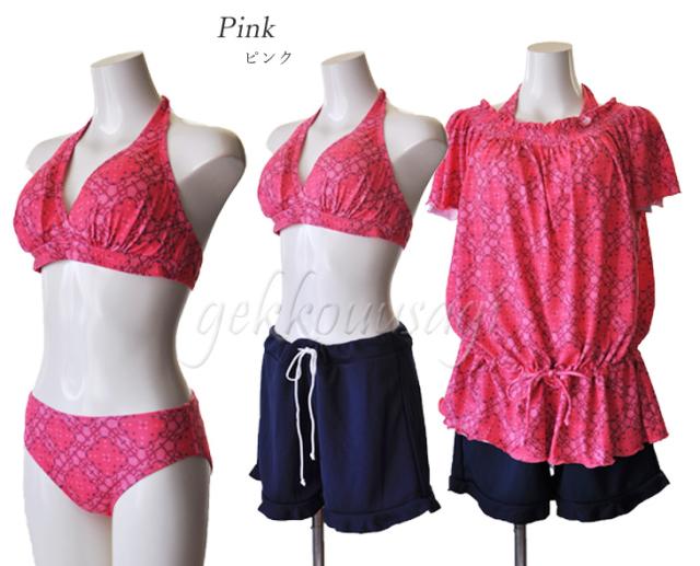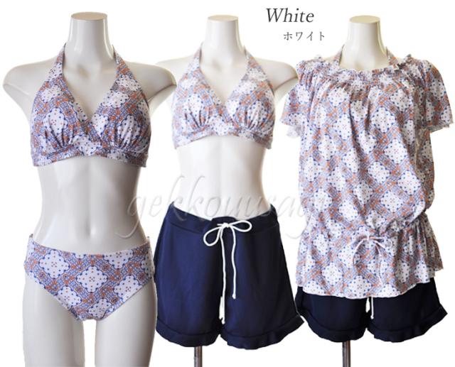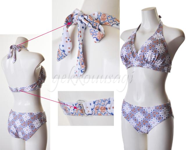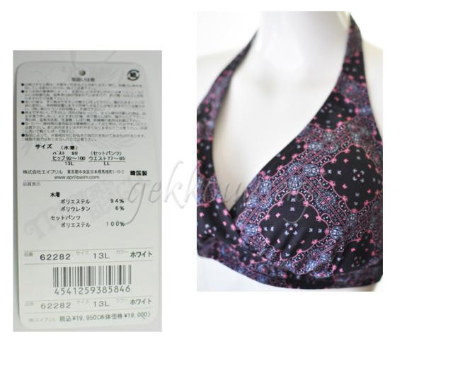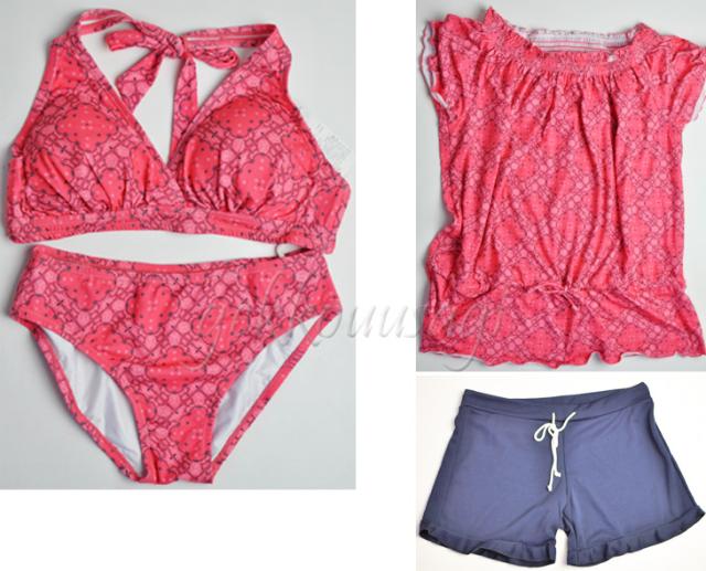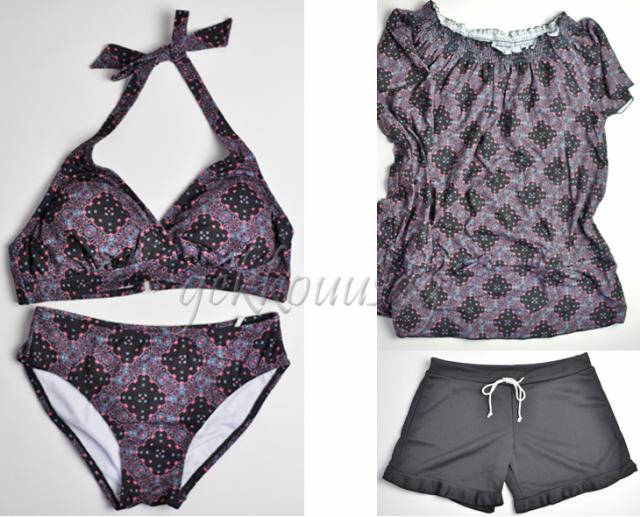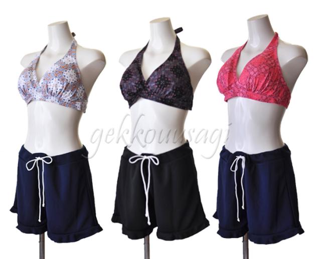 13号、15号、17号サイズのホルターネックブラ、ショーツ、トップス、ショートパンツの4点セット水着です。