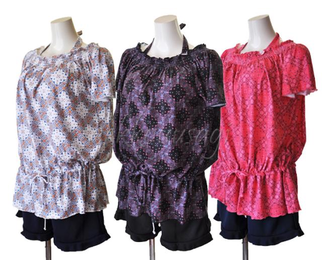 トップスはウエストひもで調節可能の裾ふんわりデザイン。