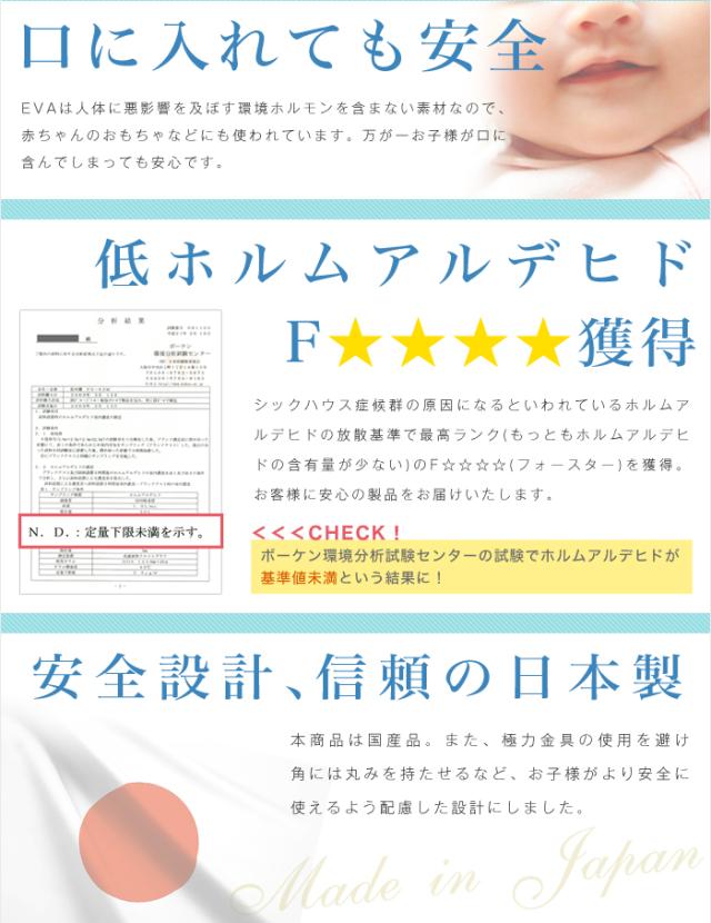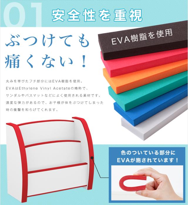 EVA樹脂は柔らかく、製品の角にお子様がぶつかってしまった時の衝撃を軽減します。また表面は汚れが落ち易くお手入れがし易い、クリーンイーゴス化粧合板を使用しています。