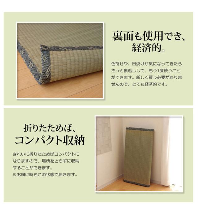 日焼けしてしまった畳のリフレッシュに、新品の畳を汚さないためのカバーにご使用下さい。長さ105〜110cm程の国産(九州産)い草を使用しています。そのうち約88cmを使用しています。ヘリ際は強く白みを帯びます。(日焼けではありません、い草の根元と先端部分の色です。い草は先端部分が赤茶色く、根元が白く真中が青(緑)色です。真中の良質な青の部分を多く使用するほど、丈夫で綺麗な仕上がりとなります。またイ草は使用するうちに日焼けをしますが、真中の青の部分を多く使用した物ほど全体が綺麗に日焼けし、味が出ます。こちらの商品は畳表と同じ織り方の糸引織で仕上げました。双目織りと比べて、い草の打ち込み本数が多いため丈夫です。表面が滑らかなので、ホコリなどがたまりにくいのが特徴です。国産(九州産)のい草を使用しています。