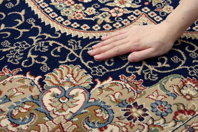 ぎっしりとパイルが詰まっていますので弾力性に富み踏み心地もしっかりとしています。また、パイル数を多くすることにより、より繊細でより色鮮やかなメダリオン柄を表現しました。プリントものには出せない高級感・重厚感のある繊細な柄をお楽しみ下さい。本商品のパイル部分にはポリプロピレン素材を使用しております。ポリプロピレンはヘタリにくく、耐久性に優れ、繊維の中でも軽い素材です。また、汚れが付着しにくく、遊び毛や毛玉が非常に出にくいという特徴もあります。本商品にはヒートセット加工を施しております。ヒートセット加工をすることで、柔らかく、なめらかなタッチ感に仕上げました。ホットカーペットカバーや床暖房にも対応しております。安心して年間お使い頂けるカーペットです。※玄関などでご使用の際は、市販のスベリ止めシートなどの併用をおすすめします。