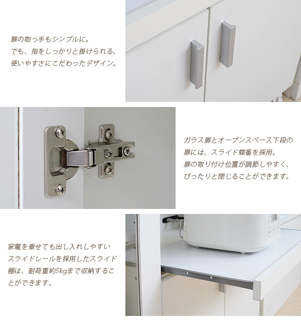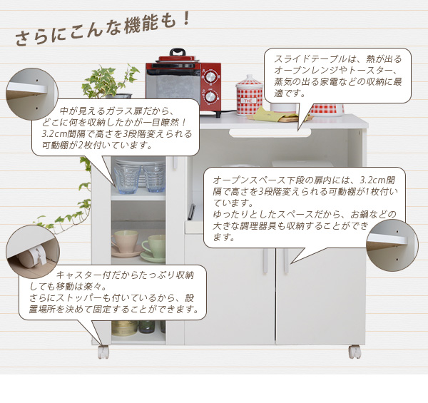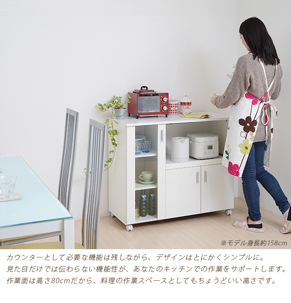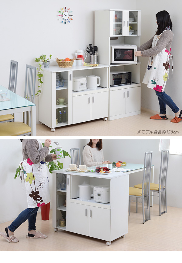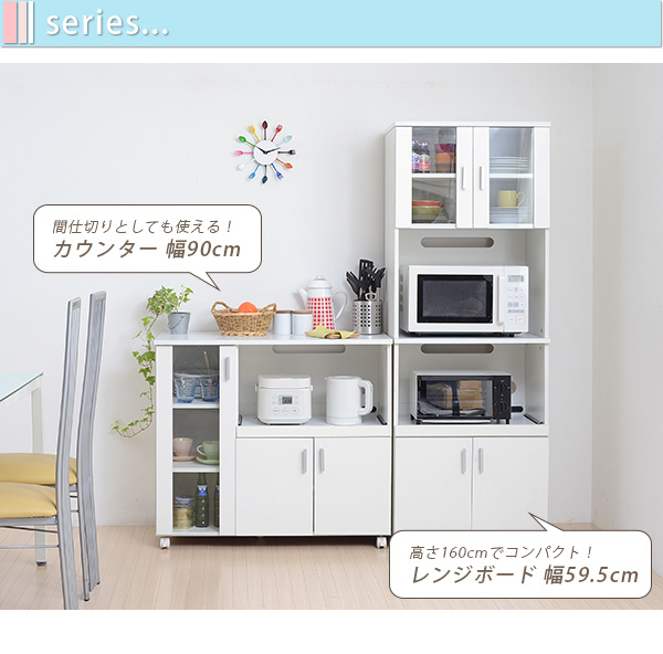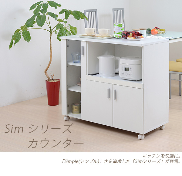 シンプルなSIMシリーズのカウンター。コンパクトでキャスター付だから、女性でもコロコロと簡単移動。ガラス扉内にオシャレな食器を収納すれば、見せる収納が出来ます。