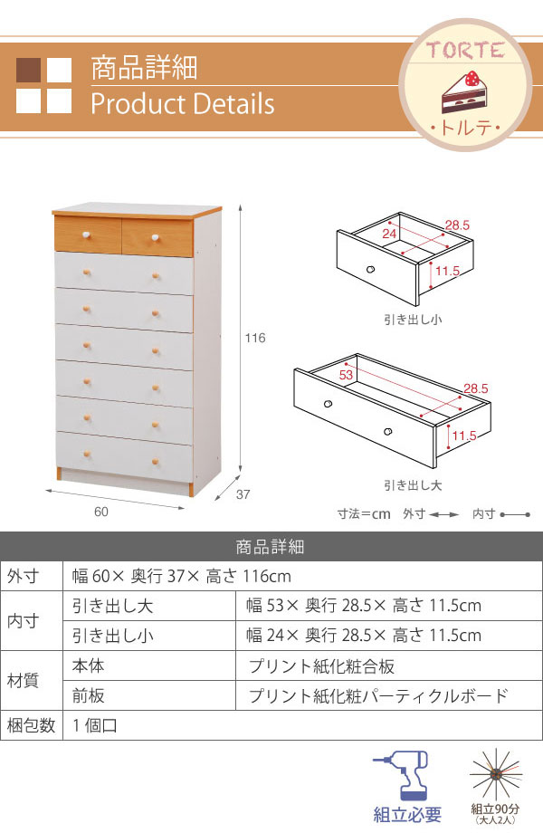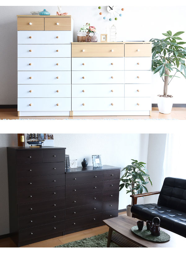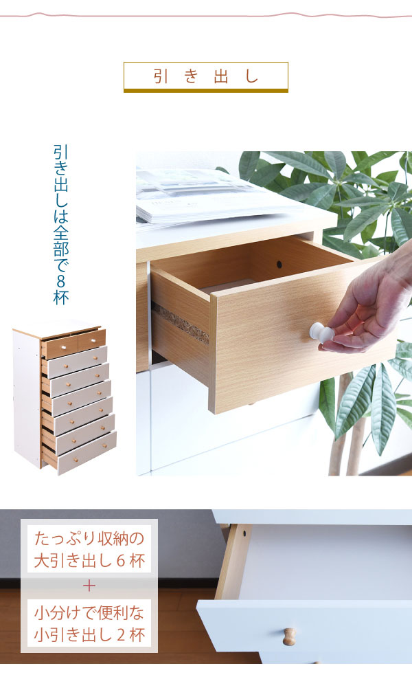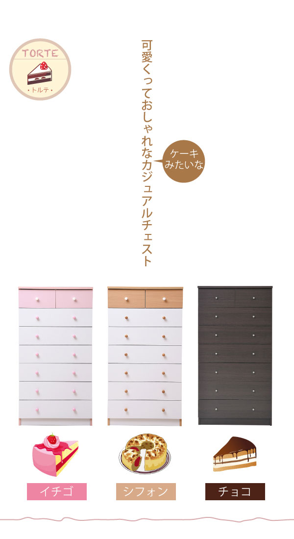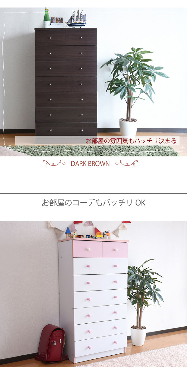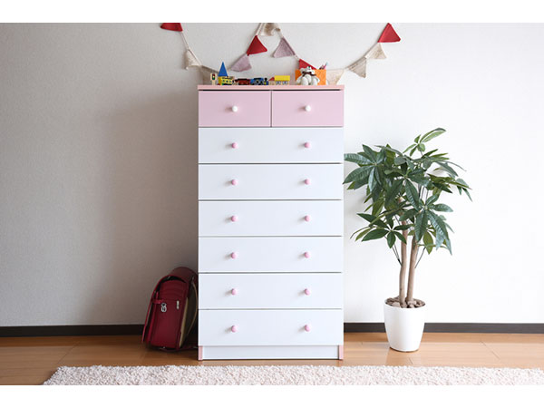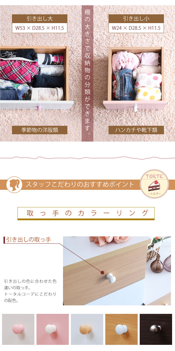 かわいいピンクとさわやかなナチュラル、シックなダークブラウンをご用意。お子様から大人まで幅広い世代にピッタリのシンプルなデザイン。引き出しには衣類から小物までたっぷり収納。