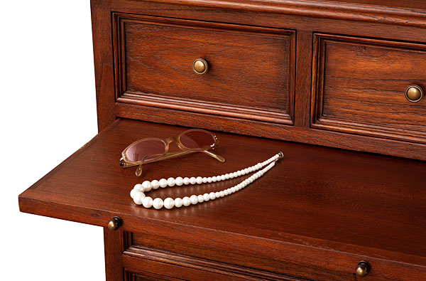 天板はレザー調の特殊な仕上げになっておりますので、高級感があります。 ネコ脚、手彫り仕上げ、引出内部の底はフェルト貼りなど、細部にまで工夫を凝らしております。玄関やリビングでもお使いください。