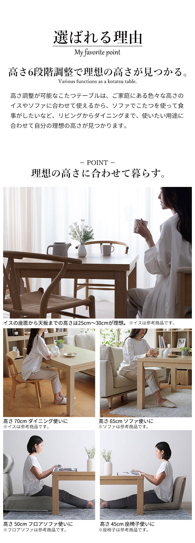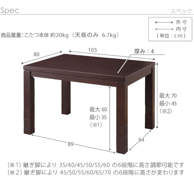 幅105x奥行80x高さ45/50/55/60/65/70cm(継ぎ脚10cmx2個 5cmx1個)