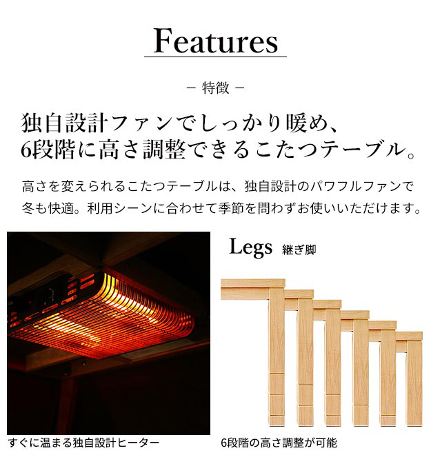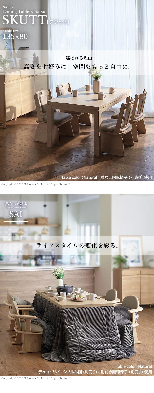 こたつ ダイニングテーブル 長方形 パワフルヒーター-6段階に高さ調節できるダイニングこたつ〔スクット〕 135x80cm こたつ本体のみ ハイタイプこたつ 継ぎ脚(代引不可)【送料無料】