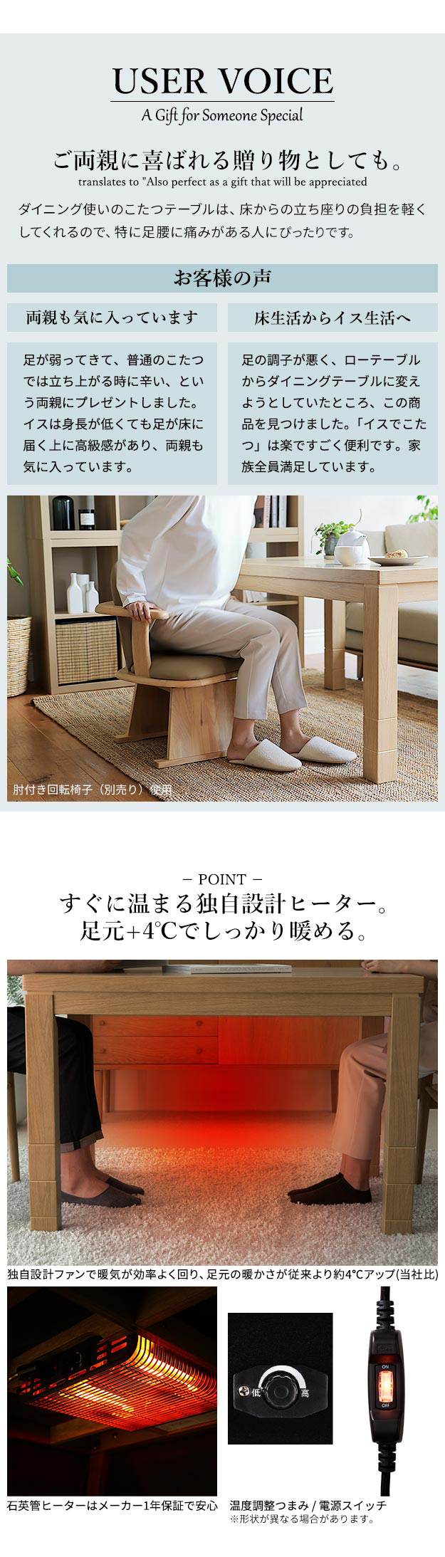 105×80cm 4点セット(こたつ本体+こたつ布団+肘付き回転椅子2脚)