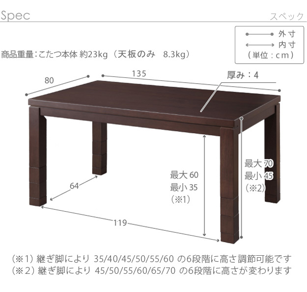 幅135x奥行80x高さ45/50/55/60/65/70cm(継ぎ脚10cmx2個 5cmx1個)