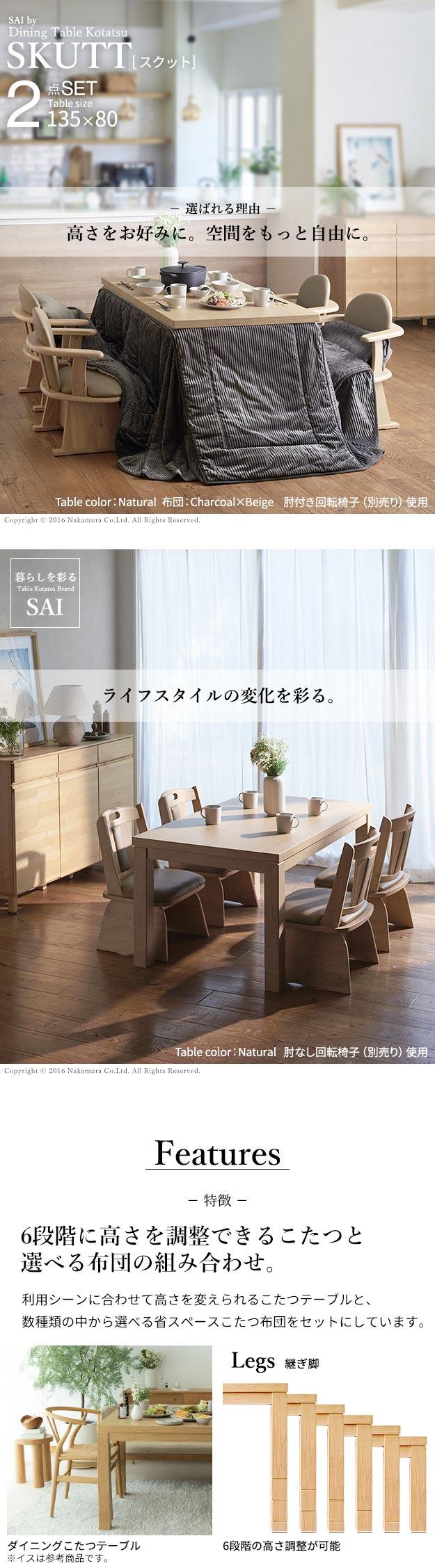 6段階に高さ調節できるダイニングこたつ スクット 135x80cm こたつ布団 2点セット SAI 彩 コタツ 長方形 ダイニングテーブル 布団セット 掛け布団 ハイタイプこたつ ファン付き おしゃれ 北欧(代引不可)【送料無料】