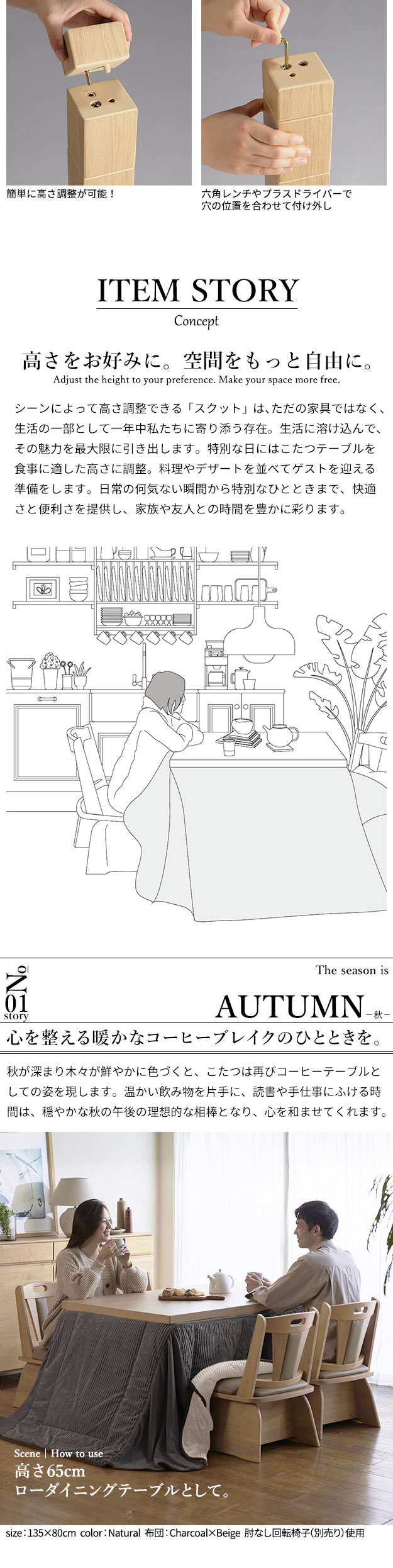 幅135x奥行80x高さ45/50/55/60/65/70cm(継ぎ脚10cmx2個 5cmx1個)