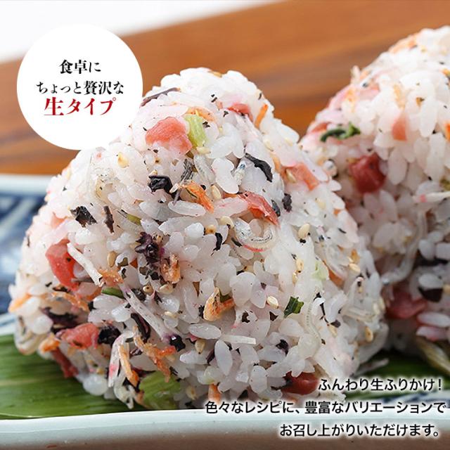 調味梅(梅、砂糖、その他)(中国製造)、ちりめん、ごま、ツノナシオキアミ、乾燥赤しそ(赤しそ、食塩)、乾燥調味野沢菜(野沢菜、食塩、ぶどう糖、砂糖)、鱈すり身加工品(鱈、小麦澱粉、その他)、調味ひじき(ひじき、砂糖、食塩、その他)、わかめ/調味料(アミノ酸等)、ソルビット、酒精、酸味料、着色料(赤102)、(一部に小麦・ごま・大豆を含む)