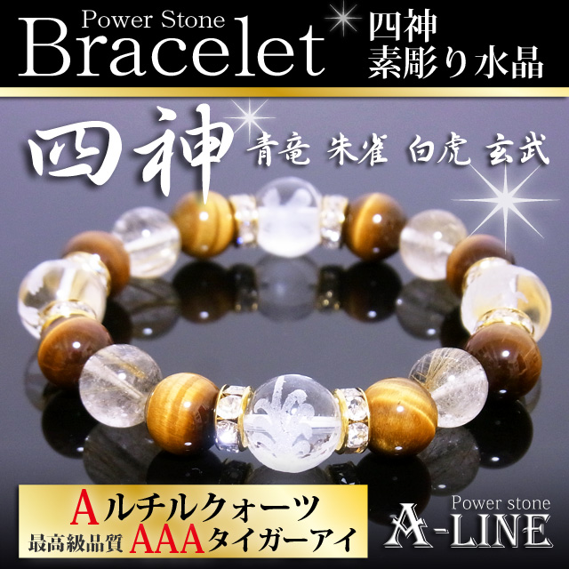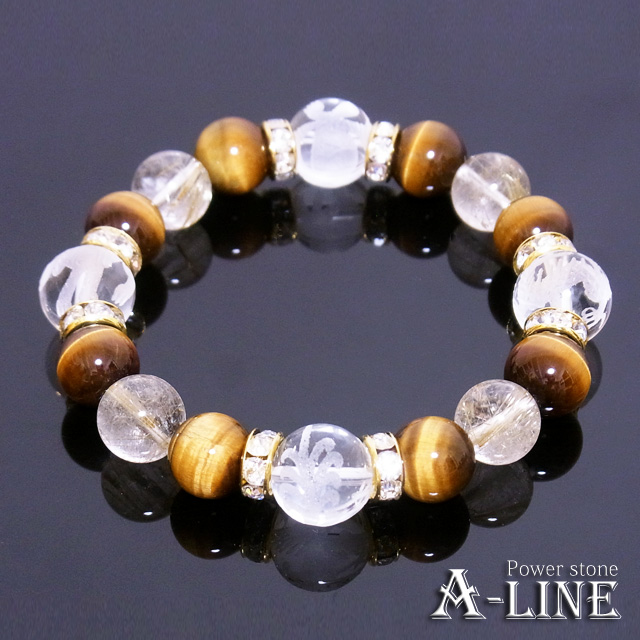 パワーストーン ブレスレット 金運UP 四神素彫り水晶12mm&Aルチルクォーツ&AAAタイガーアイ10mm PW-3129