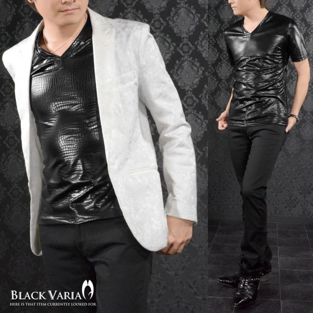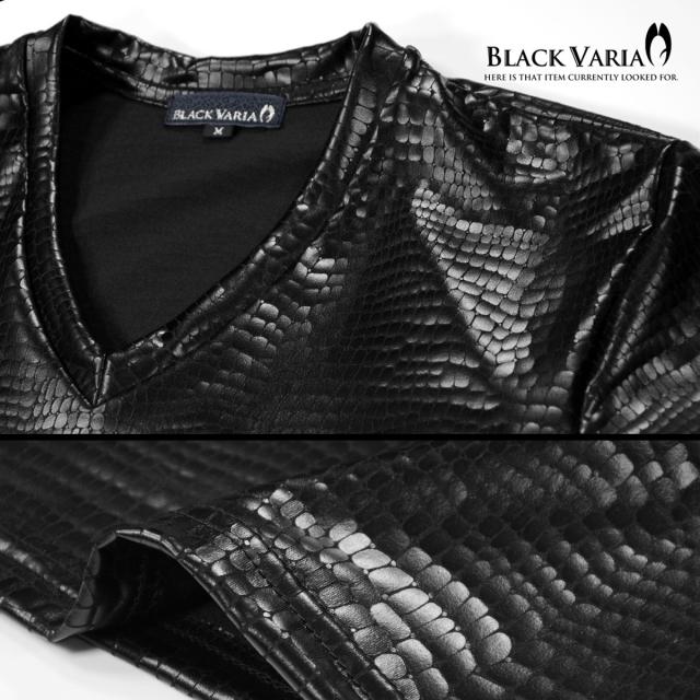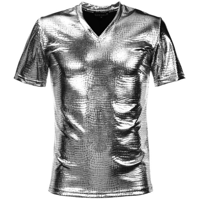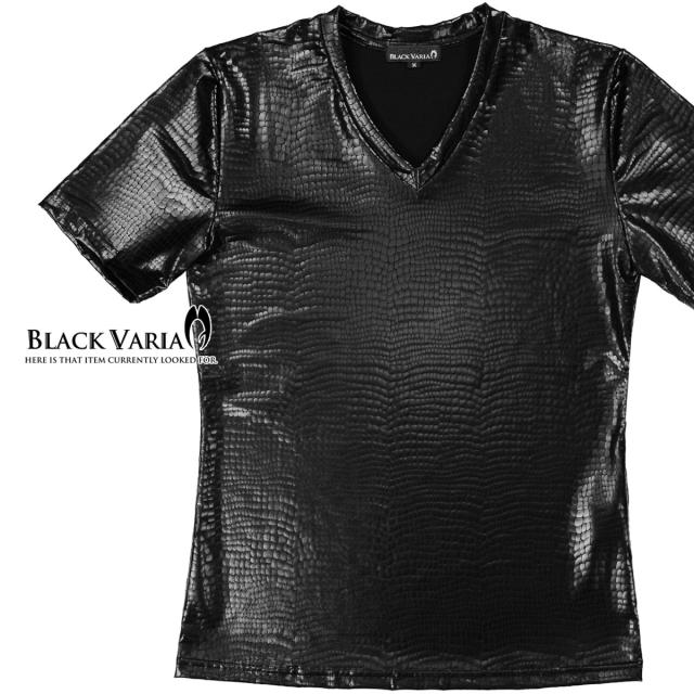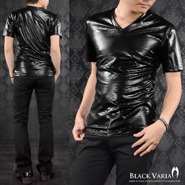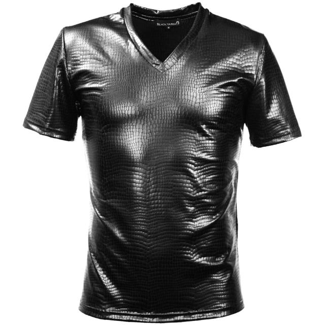 メール便可/一枚まで Tシャツ 半袖 クロコダイル メンズ Vネック 光沢 メタリック 日本製(ブラック黒) 173308