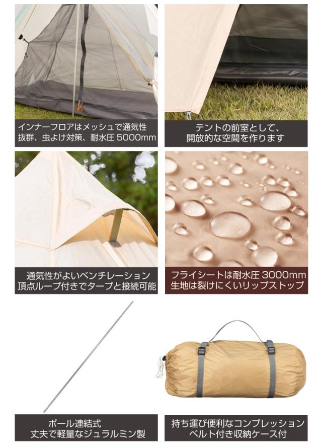■注意事項/本製品はファミリーキャンプ用として製作してありますので山岳用、常設、日常使用の頻度の高い使用は避けてください。防水加工をしておりますが、完全防水ではございません。タープや防水スプレーなどで二重三重の備え、および細やかなお手入れを心掛けてください。必ず2名以上で組立をおこなってください。