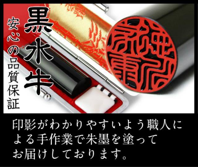 黒水牛上芯持は、耐久性・硬度・粘りにも優れ、篆刻には大変に適した材質です。芯に最も近い部分で、この芯もち部分を使用した黒水牛印鑑は最高級と言われています。弊社では天然黒水牛極上芯持を使用しています。