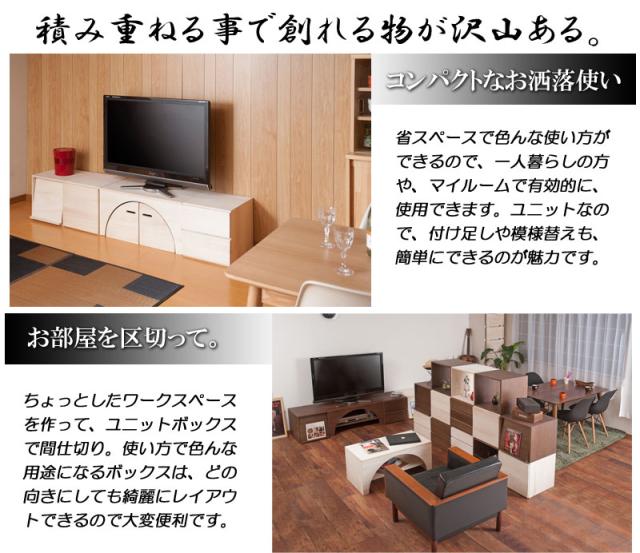 ■商品について/上質で木目の美しい桐材使用のユニットボックスシリーズ。衣類収納などによく使われている桐材を組合わせてテレビボードやキャビネットの他、組合わせ次第で様々な高級家具になり、和の雰囲気で作るのもよし、洋風なイメージで組み合わすなどのお部屋作りができます。キューブタイプのボックスが6種類とテレビ台、デスクやテーブルになるアークボックスの全8タイプに、今回はカラーだけで分けるのではなく色にあった高級材を選別して造りました。ウォールナット材のダークブラウン、メープル材(メイプル材)のライトブラウン、天然木桐材のナチュラル、MDF材に艶出し塗装を施したホワイトの4カラーから選べます。キューブ型にテレビ台やアークボックスを組み合わせる事で今までにないユニットボックスの形が無限大に広がります。
