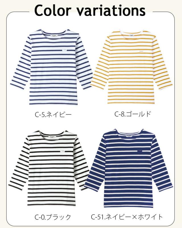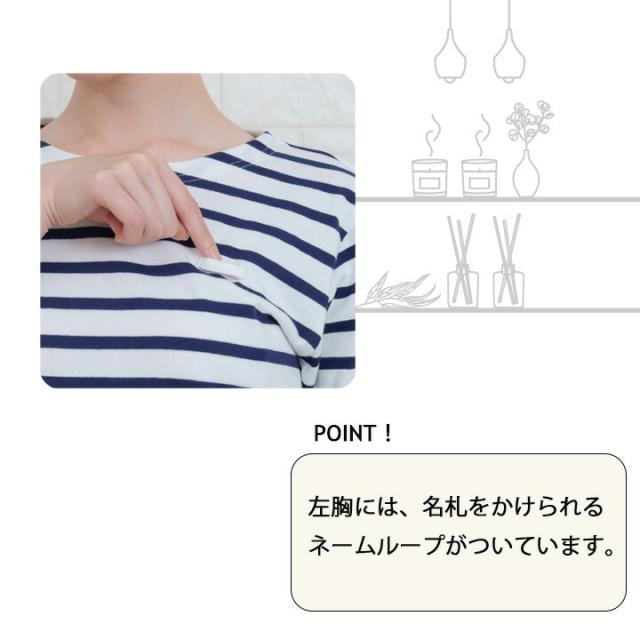 | 説明 特徴 | 1枚でも重ね着でも映える、マリンテイスト。 左胸には名札を掛けられるループが付いてカフェなどのスタッフユニフォームとしておすすめ。 七分袖で袖をまくる必要が無く作業をさまたげません。 |