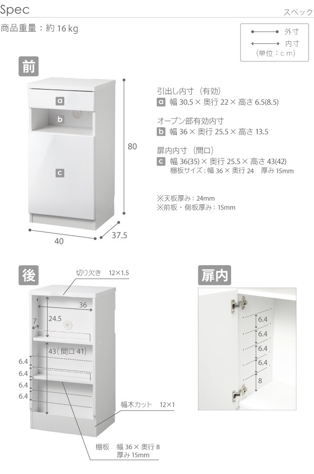 扉内内寸(間口):幅36(35)x奥行25.5x高さ43(42)cm