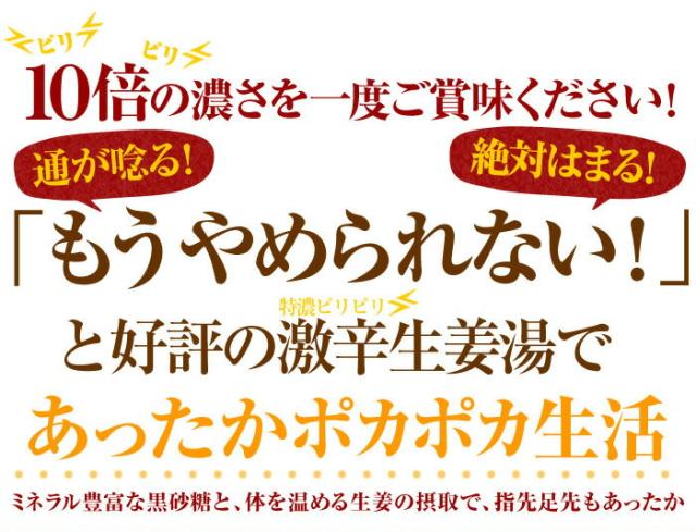 | TBSのはなまるマーケットで話題になった 国産100%黒糖入り生姜湯! 通常より5倍辛くした生姜湯より、 更に2倍生姜が多めの激辛生姜湯です! |