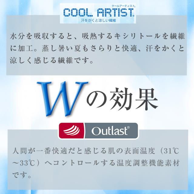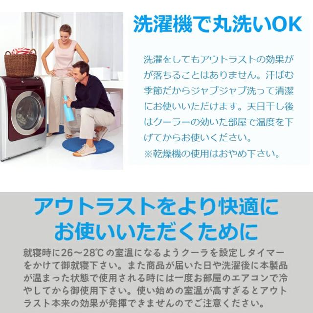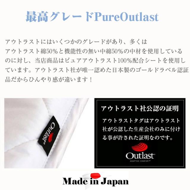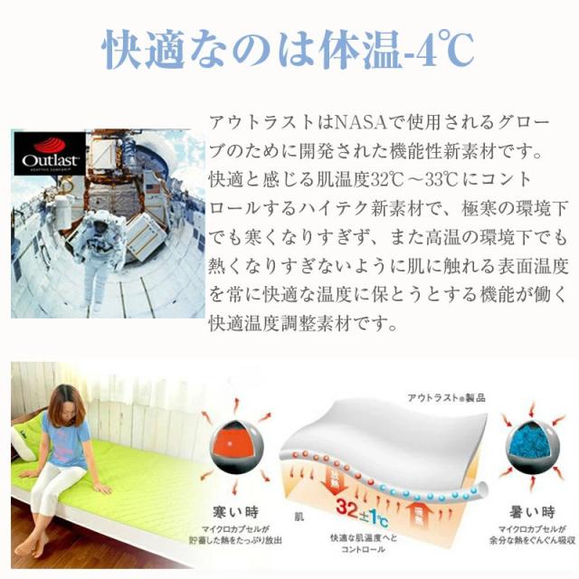 NASAで使用するグローブ用に開発された素材アウトラストと、クールアーティストのキシリトール涼感効果で最高のひんやり感を実感出来ます!アウトラストとは、人間が一番快適だと感じる肌の表面温度(31℃〜33℃)へ肌の表面温度をコントロールする温度調整機能素材です。アウトラスト社の最高基準シートを使用しており効果絶大!クールアーティストは、汗や水分を感じると熱を吸収しひんやりするキシリトールの、自然の知恵を使ったひんやり素材。寝苦しい夜の暑さにも、キシリトールの効果でひんやりとした心地よさです。【サイズ】シングル : 100×205cm、セミダブル : 120×205cm、ダブル : 140×205cm、枕パッド:47×58cm【素材】表生地:綿100%(クールアーティスト加工)、裏生地:ポリエステル65%・綿35%、中わた:ポリエステル100%、中材:アウトラスト(R)不織布シート