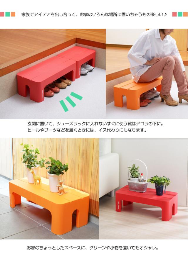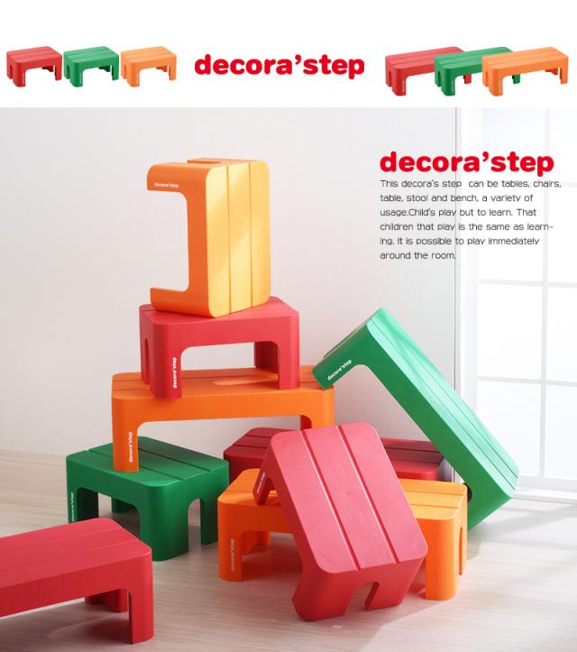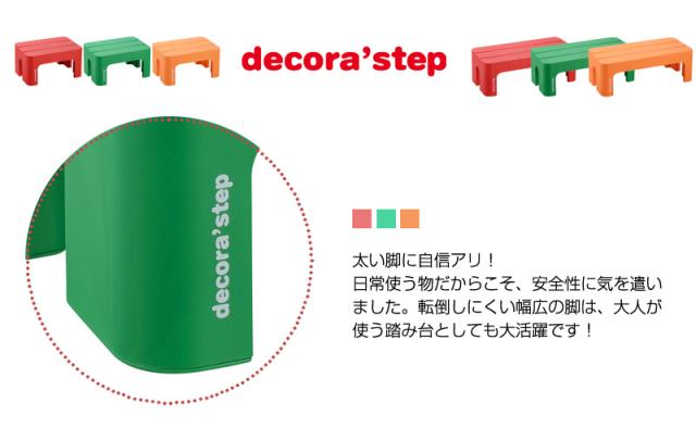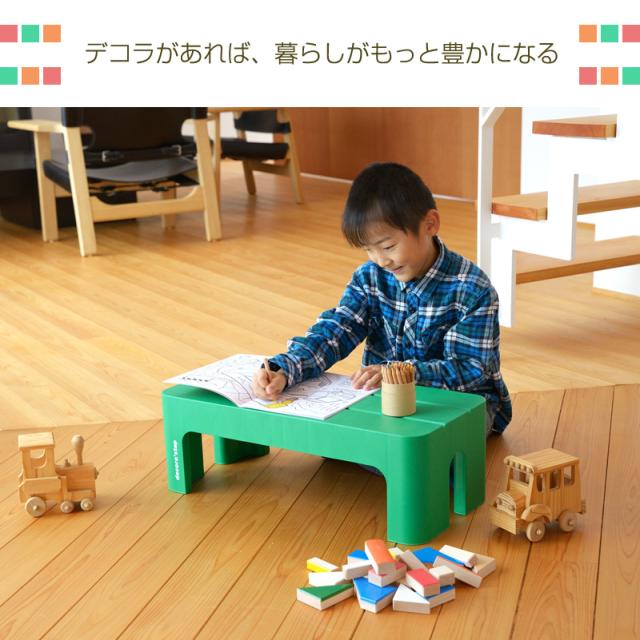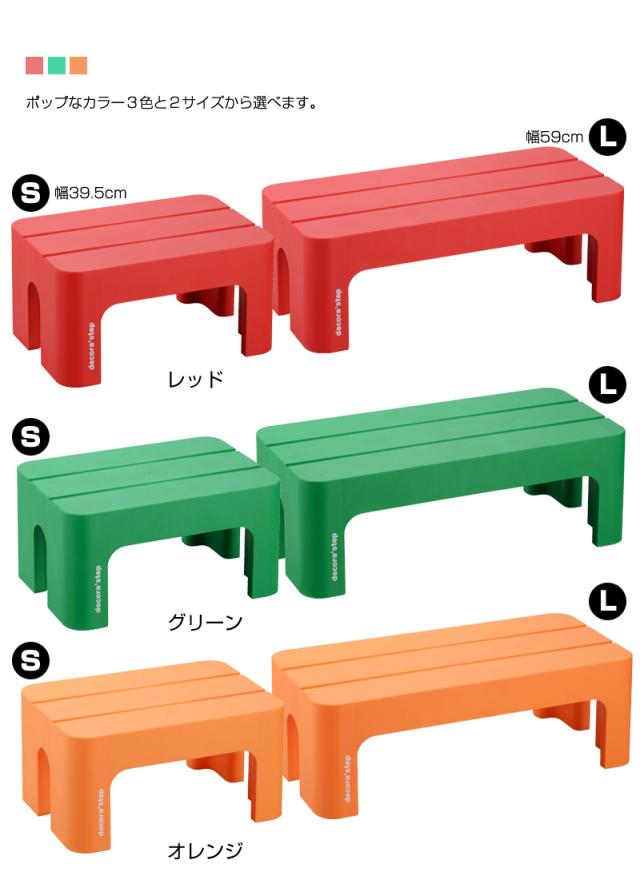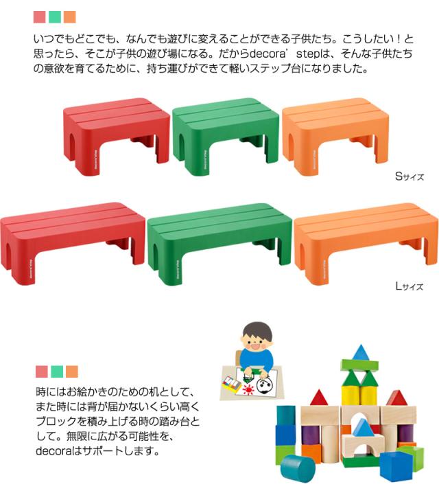 ■時にはお絵かきのための机として、また時には背が届かないくらい高くブロックを積み上げる時の踏み台として。無限に広がる可能性を、decoraはサポートします。■太い脚に自信アリ!日常使う物だからこそ、安全性に気を遣いました。転倒しにくい幅広の脚は、安全性を重視してつくられているので、耐荷重はなんと100kg!もちろん大人が使う踏み台としてもOKだから、キッチンやベランダなど活躍の場はいっぱい。玄関に置けば、足場&靴入れに早変わり♪お子様専用スペースに、きっと喜んでくれるハズ。ポップなカラー3色と2サイズから選べます。【サイズ】L:幅59×奥行28×高さ20cm【材質】本体:ポリプロピレン、脚キャップ:エラストマ【重量】1,710g【耐荷重】約100kg