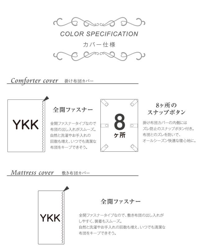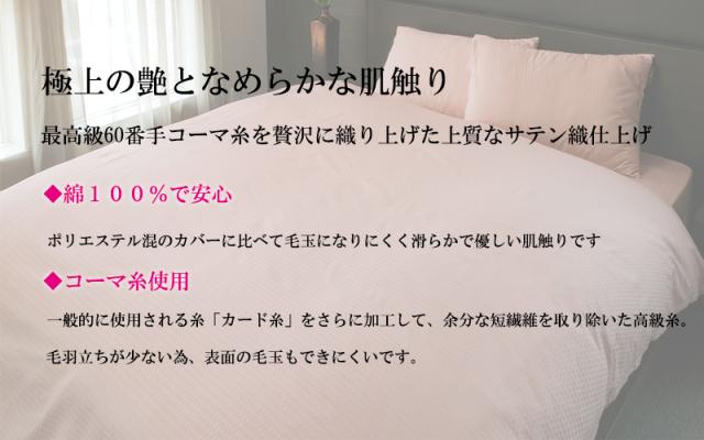 一般的に使用される糸「カード糸」をさらに加工して、余分な短繊維を取り除いた高級糸の「コーマ糸」を使用した綿100%の日本製高品質布団カバー。毛羽立ちが少ない為、表面の毛玉も出来にくいです。安心・安全にこだわる生地は、細い糸で織目が密にしっかりと詰まっている為ダニを通しにくく清潔。(財)ニッセンケン品質評価センターのダニ通過性試験においても証明されています。また、防虫剤などの薬品は一切使用していないので、お子様やお年寄りにも安心です。最高級60番手コーマ糸を贅沢に織り上げた上質なサテン織仕上げの布団カバーです。