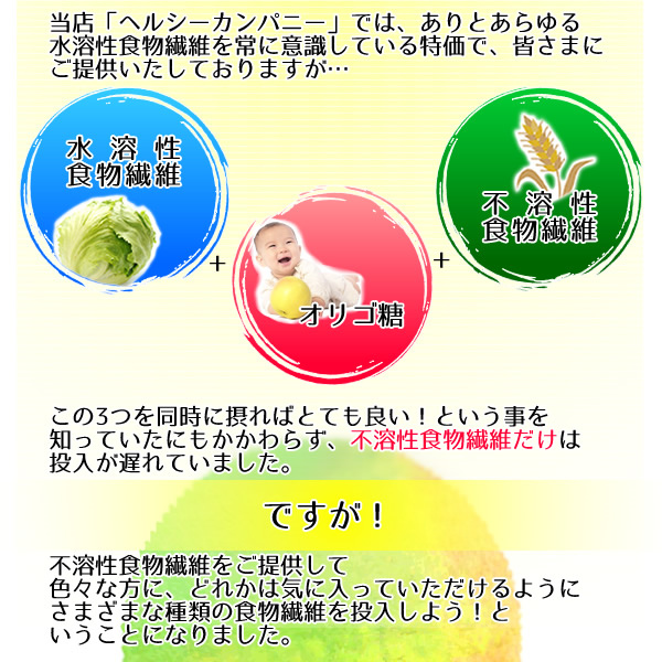 数々の食物繊維を取り扱っておりますヘルシーカンパニーですが、今までの食物繊維はすべて【水溶性】食物繊維でした。 食物繊維には2種類あり、【水溶性】【不溶性】がございます。 この2つと合わせて【オリゴ糖】を一緒に摂れば、とても良い相乗効果が得られるそうです。 水溶性食物繊維だけでは、お腹の中のものを押し出してくれる力が足りず、不溶性食物繊維だけでは、善玉菌のエサとしての役割が弱く、オリゴ糖だけでは、食物繊維不足の方の補助にはならず・・・ 3つを、お客様それぞれのお身体の状態に合わせ割合を変えて摂ることで今までの水溶性食物繊維のみお召し上がりになったときより、お悩みがさらにスムーズに解決するかもしれません。 |