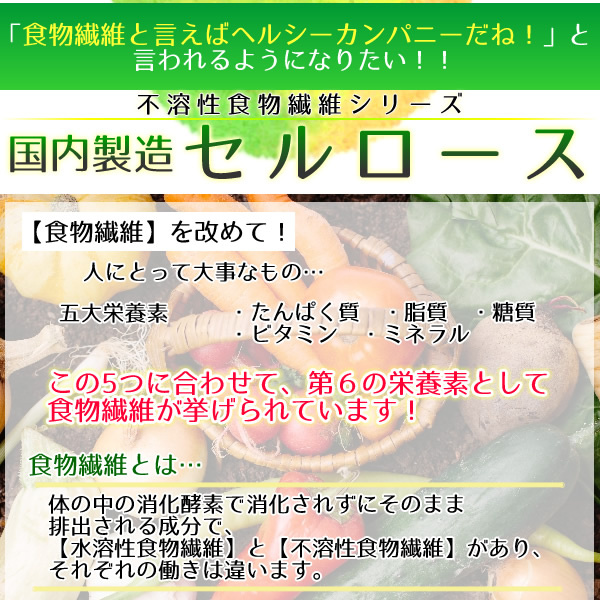 | 原材料名 不溶性食物繊維(セルロース) 【生産国:日本 最終包装地:日本】 |