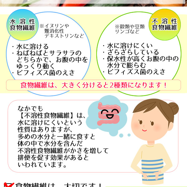 水溶性食物繊維だけでは、押し出してくれる力が足りず、不溶性食物繊維だけでは、役割が弱く、