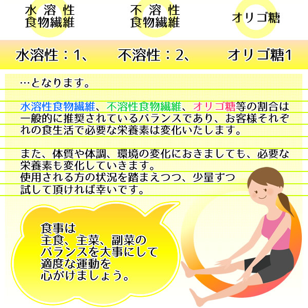 3つを、お客様それぞれのお身体の状態に合わせ割合を変えて摂ることで今までの水溶性食物繊維のみお召し上がりになったときより、