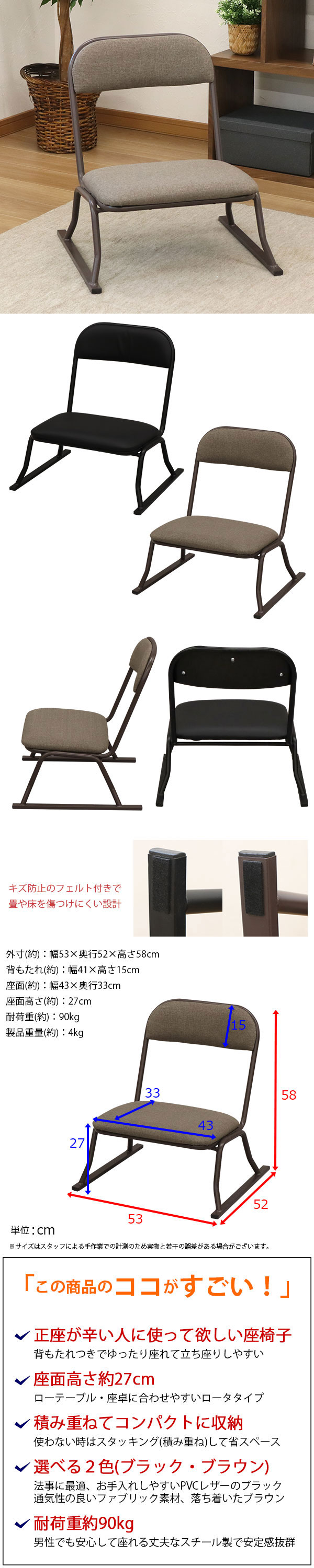 商品名:座椅子 高座椅子 座敷椅子 楽座椅子(単品) 積み重ね可能 座敷 椅子 畳み椅子 仏壇椅子 座いす 座面 低い 座イス 幅53cm 奥行52cm 高さ58cm 座面高さ27cm 集会所 お寺(法要 法事 本堂 和室 和式) シンプル 高齢者 イス スタッキングチェア ブラック ブラウン 完成品