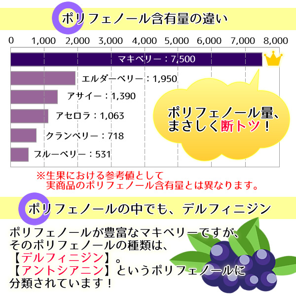 マキベリーは、南米・チリのパタゴニアという寒冷地帯で自生している果実の事です。 先住民族マプチェに重宝されていたといわれています! マキベリーは、高さは3〜5mの常緑灌木で、果実は直径約6mmほどの球体でつやのある黒色です。 完熟するのは1〜3月くらいまでの約3か月ほどで、甘みがあって食べやすく美味しいらしいです! マキベリーは何といっても、ポリフェノールの宝庫! 美容を意識する方には重宝されているアサイーのなんと約5.4倍も含まれています。 マキベリーの中のポリフェノールは、アントシアニンが主ですが その中でも 【デルフィニジン】が殆どを占めていて、あなたの美容を強力にサポートします。 マキベリーに含まれるポリフェノールの種類は、【デルフィニジン】。 日々パソコンなどOA機器を使われる方におすすめな【アントシアニン】に分類されています! |